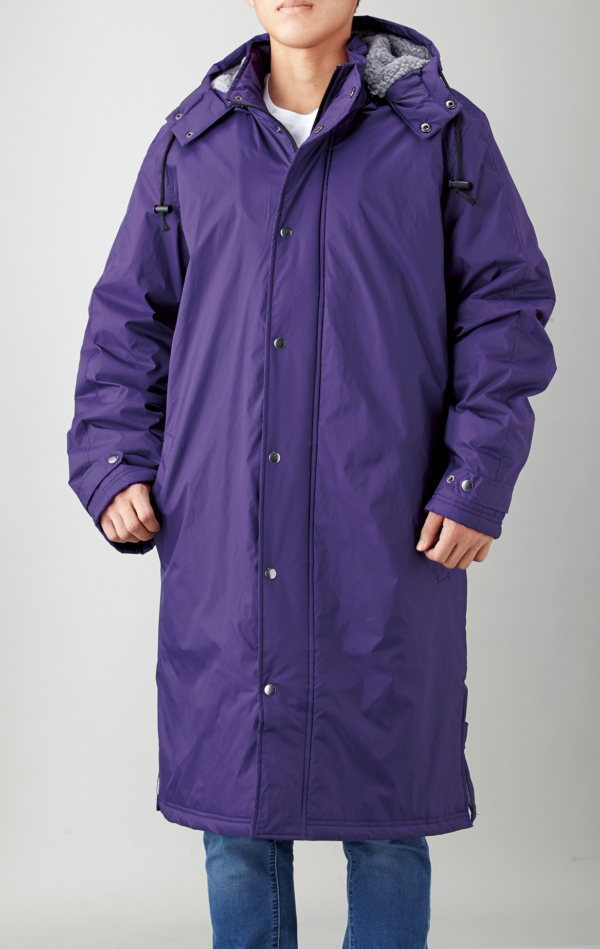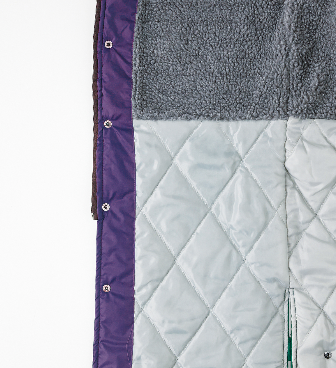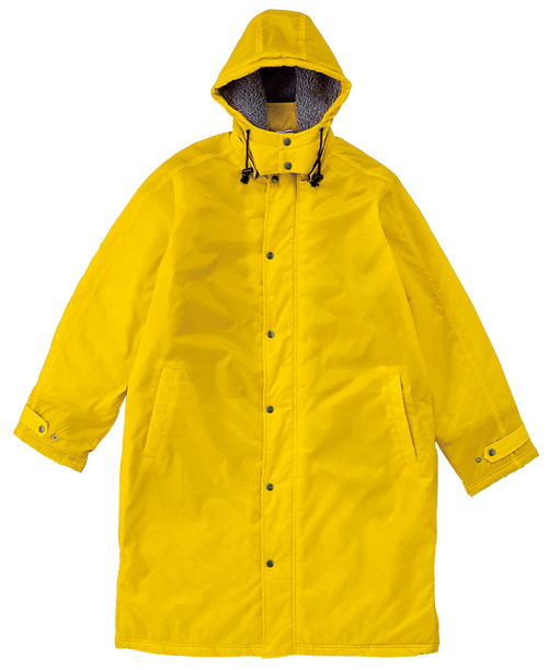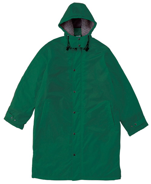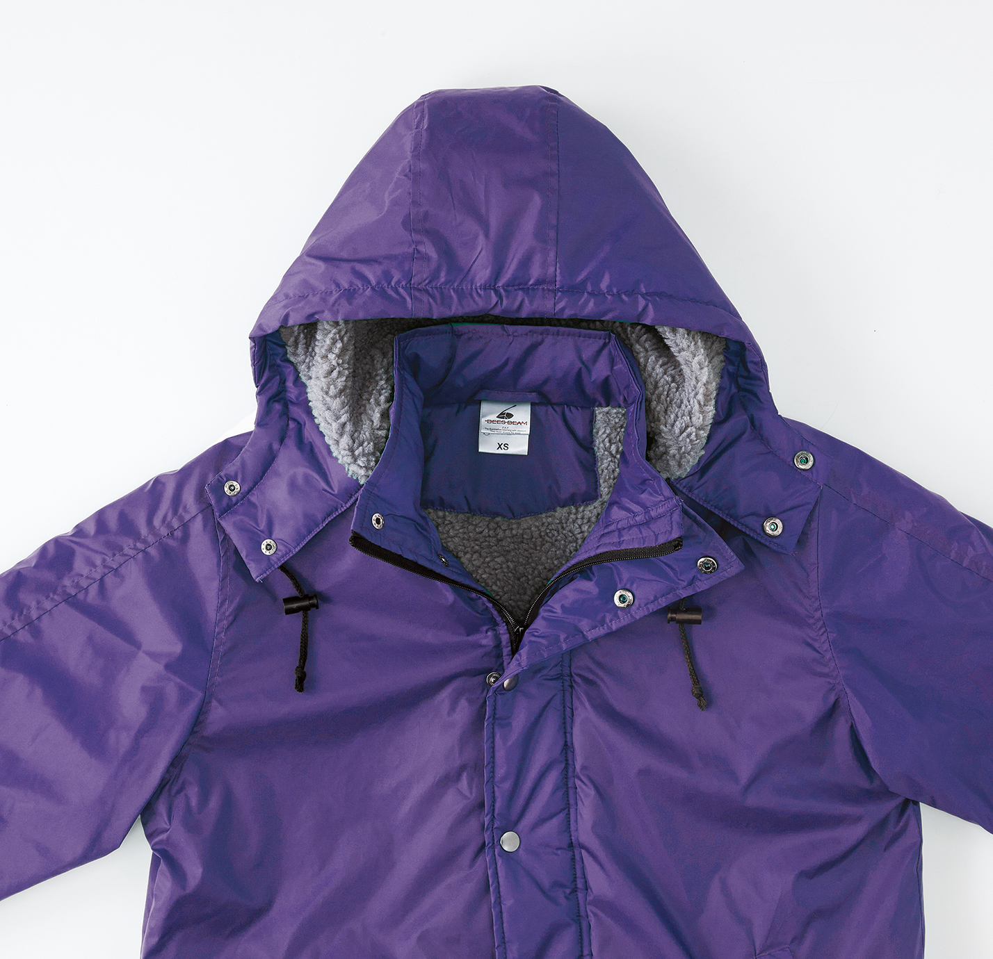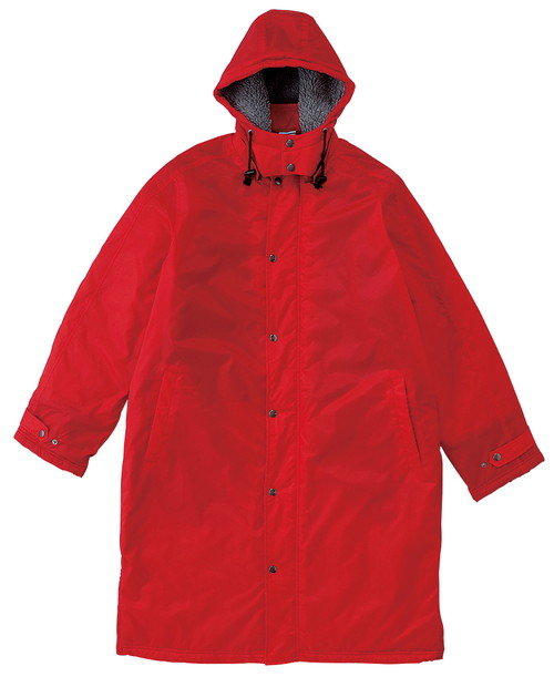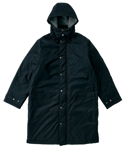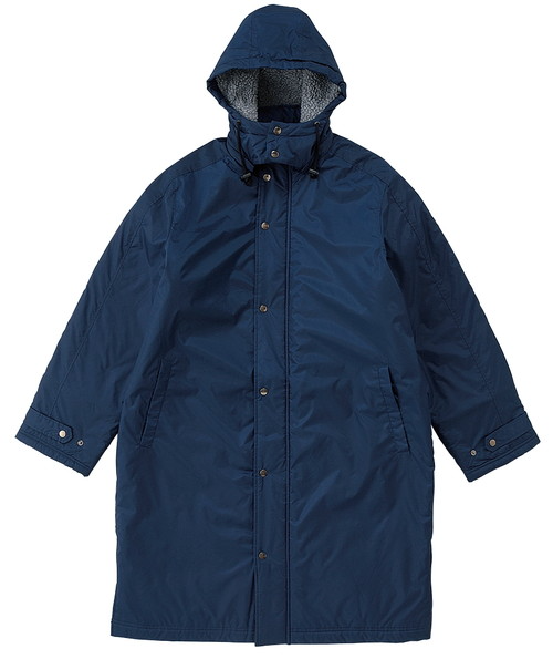 冬の屋外に最適な、ボア付きナイロンベンチコート。裏地には、キルティング生地とボアを使用。袖入り口はボアで保温性を確保し、袖全体はキルティング生地。
