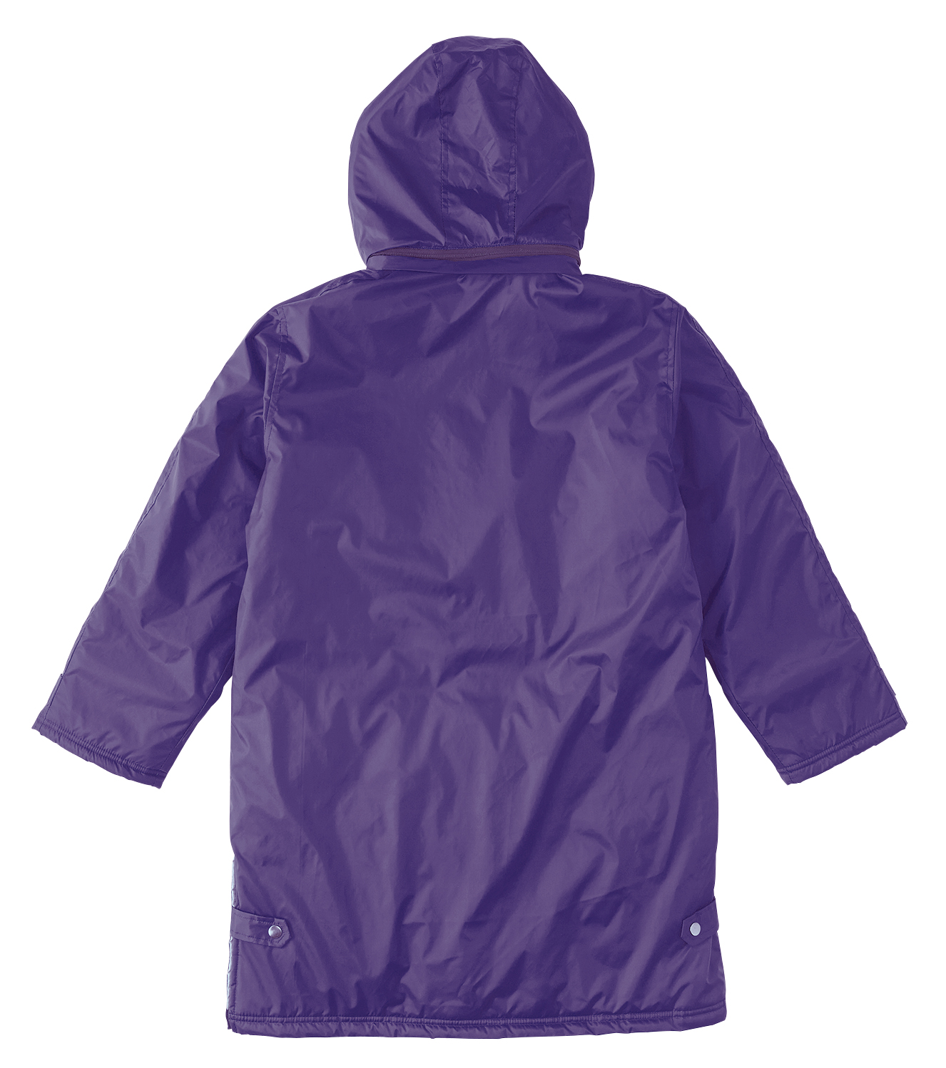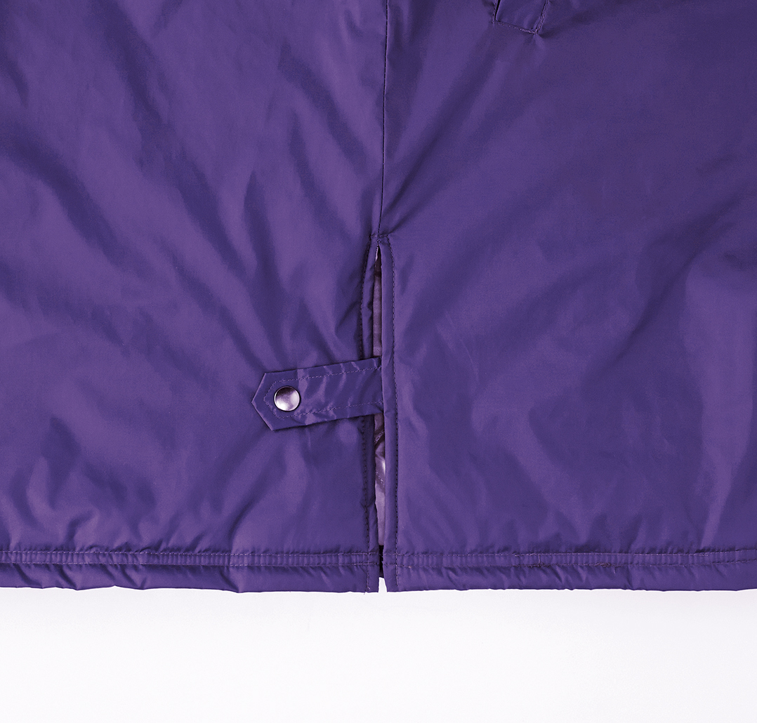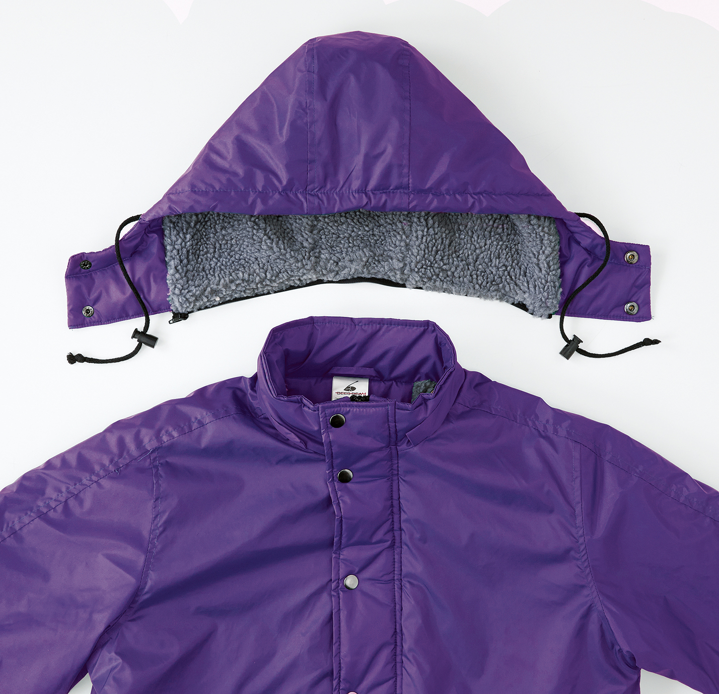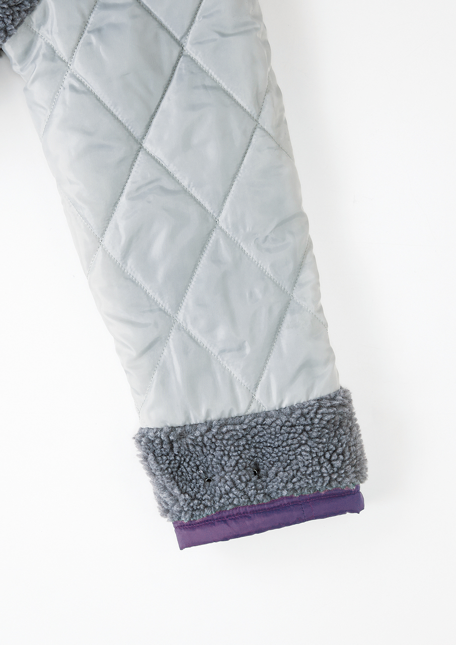 冬の屋外に最適な、ボア付きナイロンベンチコート。裏地には、キルティング生地とボアを使用。袖入り口はボアで保温性を確保し、袖全体はキルティング生地。