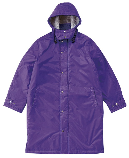 冬の屋外に最適な、ボア付きナイロンベンチコート。裏地には、キルティング生地とボアを使用。袖入り口はボアで保温性を確保し、袖全体はキルティング生地。